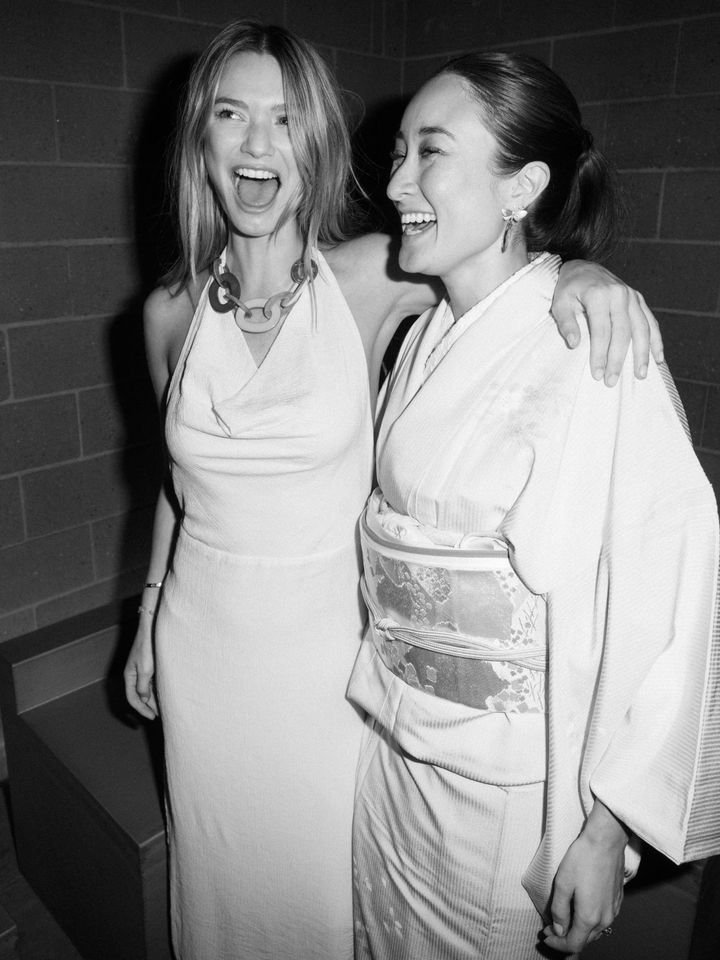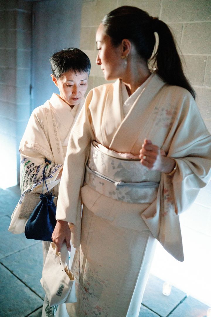 その後、ニケユは母親が日本から持ってきた着物に着替えた。「ほとんどの人は、伝統的な着物が、これほどまでに何層にもなっている、複雑な構造のものだということを知らないと思います。ふたりのメイド・オブ・オナーに着付けを体験してもらいたかったので、母を手伝ってもらいました。カオスで、自分のパーティーに遅刻してしまったんですけれど、ウエディング全体を通して、一番思い出に残る出来事のひとつでした」と冗談めかして語った。
