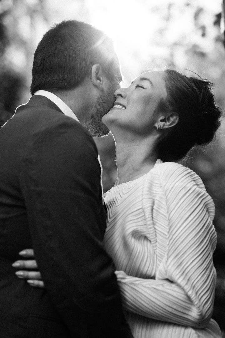 プロポーズは、愛犬のマギーとベアーを連れて、ハンプトンズの夕暮れのビーチを散歩していたときに受けた。その前から、ジェームズがプロポーズを計画していることを察していたというニケユは、散歩の間中、今か今かとその瞬間を待っていた。「ひざまずいて、プロポーズしてくれました。そしたらイングリッシュ・スプリンガー・スパニエルのマギーが大暴れして。マギーはちょっとクレイジーなところがあって、あのときもとにかく走り回って、海に入って、濡れて騒いでいました。ふたりとも犬が大好きなので、マギーの姿を見て終始笑っていた気がするんですけれど、それがまた、とてもいい演出になってよかったです」と彼女は振り返る。婚約指輪は、代々受け継がれてきたグラフ(GRAFF)のエンゲージメントリング。ダイヤモンドがゴールドにセットされたそれは、ニケユが結婚式で身につける“サムシング・オールド(何か古いもの)”のもののひとつとなった。