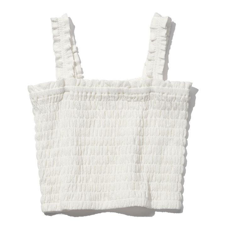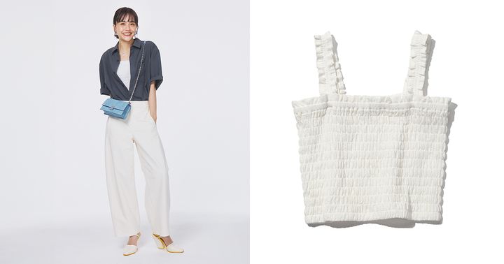 夏イベントは1枚で、ジャケットに忍ばせれば程よく抜け感が加わる旬度の高い1着。シャーリングキャミソール¥1,290〈一部店舗のみ販売〉(GU)