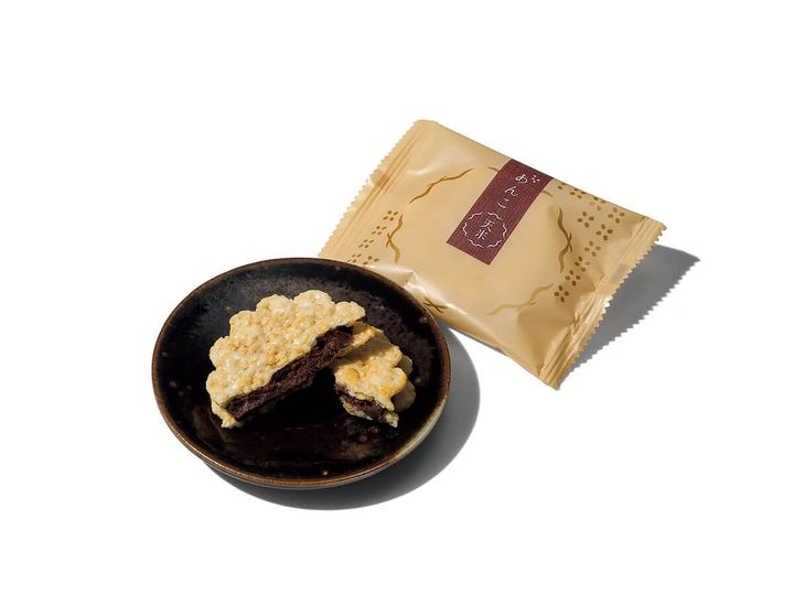お米の粒感が残るせんべいで、あんこをサンド。塩気と上品な甘さ、ザクッとした香ばしさとこしあんのなめらかさと、味と食感、両方のコントラストが楽しい一品。減農薬米や北海道産の小豆が使用され、素材本来のおいしさが伝わってくる洗練された味わいです。売り切れ続出ではあるものの、新宿や銀座などの百貨店や東京駅地下にも店舗があります。