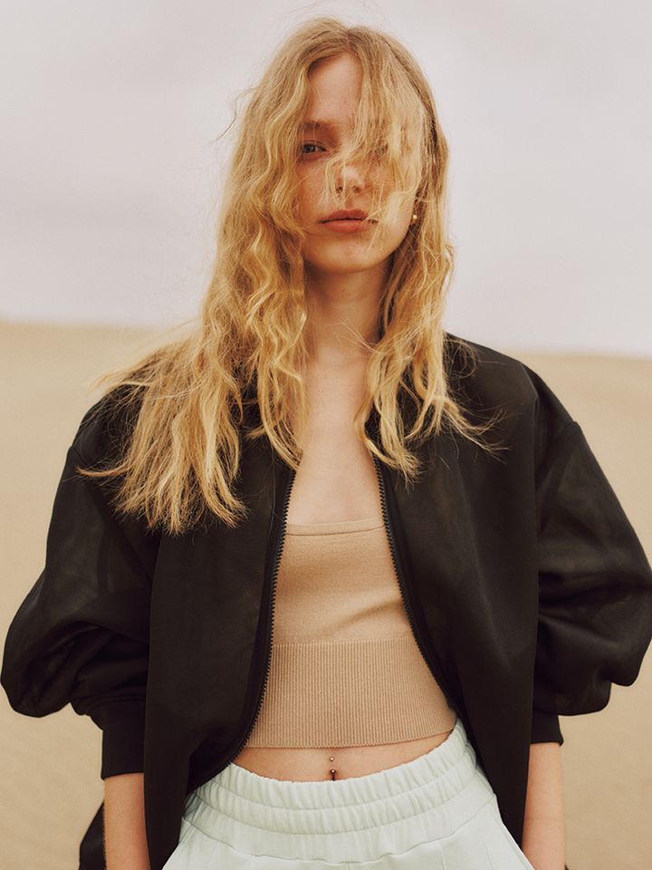 素材自体がセンシュアルだから、形はあえてメンズライクなブルゾンを。ユニセックスならではのほどよいゆとりと、てろっとしすぎない適度な硬さも透けを着やすくするポイントに。