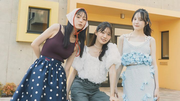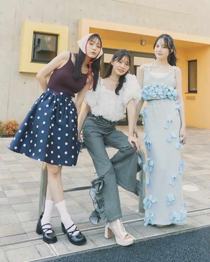〈右・紗来のコーデ〉リボンニットビスチエ 11,550円、リボンニットスカート 19,800円/ともにJ1U by LA BELLE ETUDE(アンティローザ)キャミソール 10,780円/lilLilly(lilLilly TOKYO)イヤーカフ 1,320円/アネモネ(サンポークリエイト)サンダル 14,300円/dazzlin〈中央・紅葉のコーデ〉フラワートップス(キャミワンピースとセット)19,910円/RANDA スリットリボンデニムパンツ 19,580円/lilLilly(lilLilly TOKYO)チョーカー 3,960円/アネモネ(サンポークリエイト)サンダル 30,800円/ダイアナ(ダイアナ銀座本店)〈左・里帆のコーデ〉ニットキャミソール(ホールターネックひもとセット)6,600円/COCO DEAL(ココ ディール)ドットミディスカート 20,900円/Mardi Mercredi(MARDI MERCREDI JAPAN) イチゴ柄バブーシュカ 2,990円/NADIA FLORES EN EL CORAZON パンプス 9,900円/チャールズ&キース(チャールズ&キース ジャパン)ソックス/スタイリスト私物