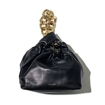 ストラップつきチェーンハンドルバッグ(16×19×11.5)/デメリエー(アダム エ ロペ) 大ぶりなゴールドチェーンがアクセント。マチ広めの巾着型で、見た目以上の収納力。内側にはファスナーポケットつき。