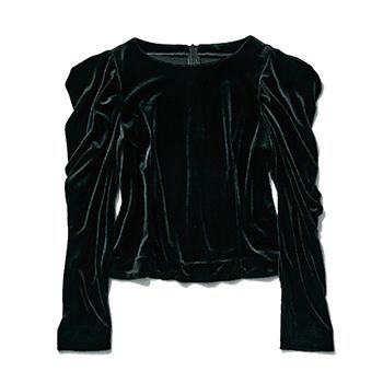 黒ベロアトップス/シーニュ 肩のドレープが効いたベロアの質感は、夏の軽やかな装いに上品な重厚感をプラス。室内でのディナーなら、この「季節はずれの素材」がかえって印象に残る。