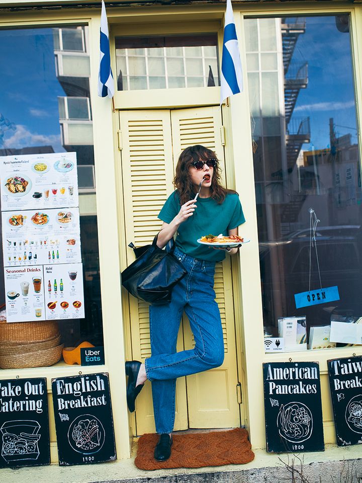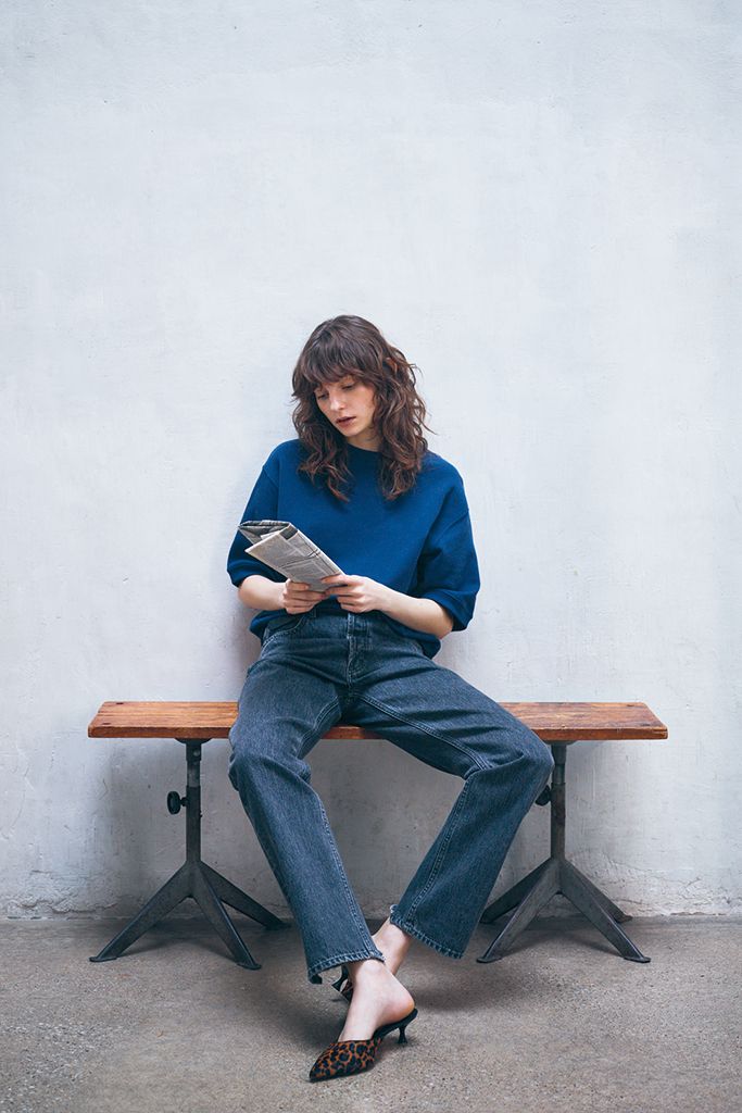 ハイウエストデニムのレトロなムードと波長が合う、コクのあるグリーンを選択。カーキよりも濃く、ダークグリーンより浅い、色落ちしたような深色で、ありふれたスタイリングに雰囲気が出る。トップスは厚いガーゼのような、ふかふかとしたコットン素材。