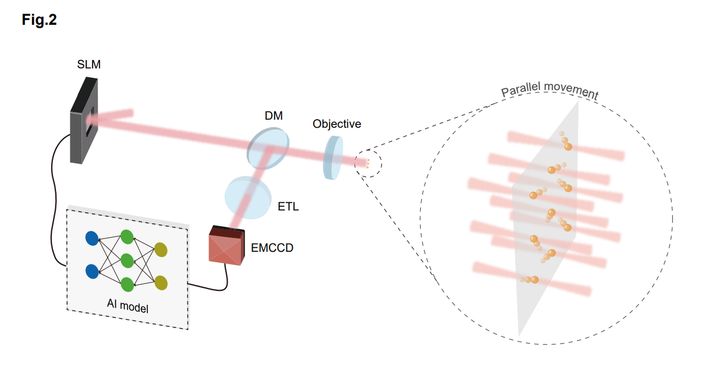 FIG2は、この実験に使われた装置の全体像を示しています。まず、レーザーの光を「空間光変調器(SLM)」という特殊なスクリーンに通すことで、好きな場所に光の焦点を作り出します。この光の焦点が「光ピンセット」となって原子を捕まえます。レンズや鏡などを通してレーザーの焦点を細かく制御し、たくさんのトラップを平面や立体的に並べられるようにしています。原子がどこにいるかは、蛍光の光を特殊なカメラ(EMCCD)で撮影して観察します。立体的な配列の場合は「電気で焦点を変えられるレンズ(ETL)」を使い、層ごとにピントを合わせることもできます。この全体の流れの中で、AIがリアルタイムで光のパターン(ホログラム)を設計してSLMに送り、原子たちを同時に目的の場所に誘導する仕組みになっています。Credit:AI-Enabled Parallel Assembly of Thousands of Defect-Free Neutral Atom Arrays