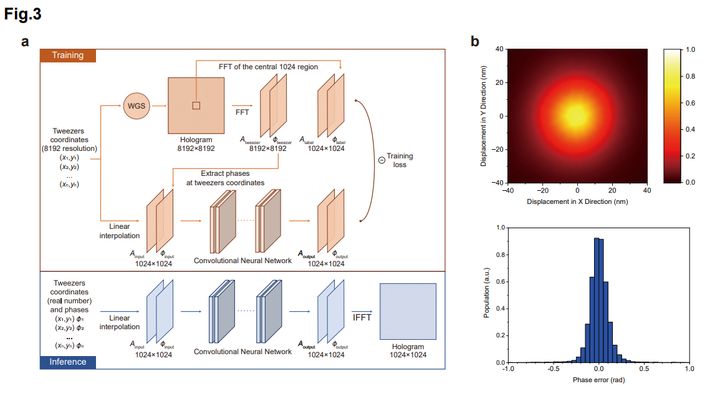 FIG3は、原子を動かすためのホログラムをAIがどうやって作り出しているかを表しています。まず、研究チームは、原子の動かし方のシミュレーションデータをたくさん作り、それをAI(ニューラルネットワーク)に学習させました。AIは、「この原子をこの場所に動かしたい」という情報を受け取ると、自動的に最適なホログラム(光の設計図)を一発で計算できるようになります。ホログラムは「どこをどのくらいの強さと位相で光らせればよいか」という複雑な情報を含みますが、AIはこれを非常に速く正確に計算します。また、AIが作ったホログラムをもとに原子の配置を実際に動かした結果、位置の誤差は20ナノメートル(1ミリメートルの50000分の1)ほどしかなく、位相のズレもごくわずかでした。「AIの学習→推論→実際のホログラム生成→高精度の移動」という流れがわかるでしょう。Credit:AI-Enabled Parallel Assembly of Thousands of Defect-Free Neutral Atom Arrays