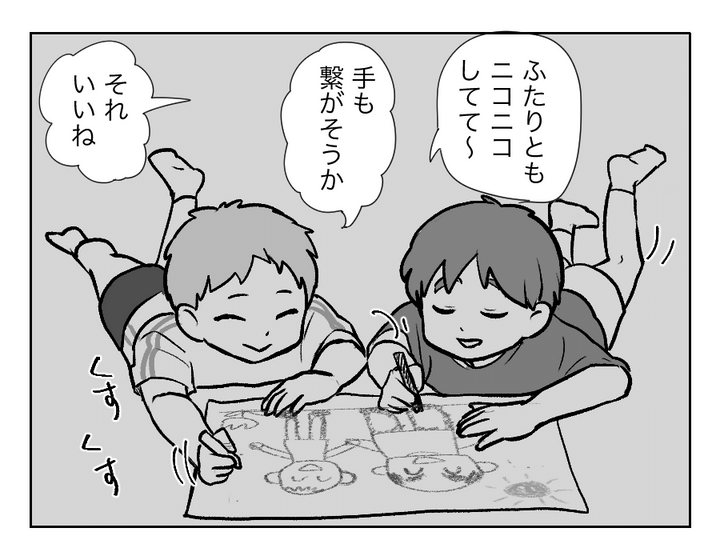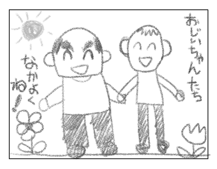 山田家のおじいちゃんは、お酒と一緒に孫たちが書いた自分たちの絵をもってきてくれました。2人で仲良く手をつないでいて、可愛い字で「なかよくね!」の文字も書いてありました。