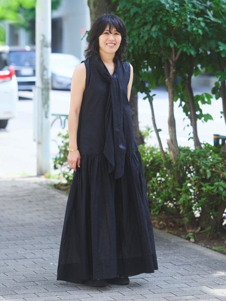 ワンピースは「プランシー」のマキシドレス。「透け感のある軽やかなコットン素材なので涼しいです。夏は楽チンでサマになるワンピースが定番ですね」と大沼さん。スカート丈に合わせて足もとには少しヒールの高いサンダルをチョイス。「夏はシンプルなコーディネートになるので、アクセサリーも少し盛り気味です(笑)」。