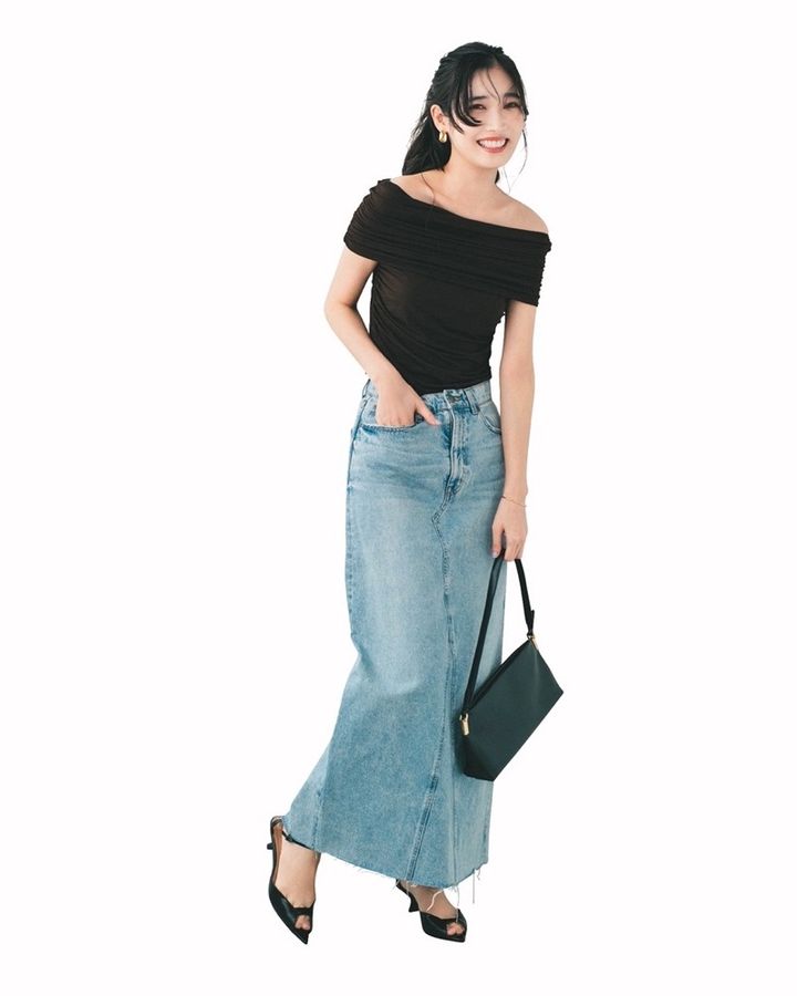 8月13日(水)、裾のカットオフが効いたライトブルーのデニムスカートは、カジュアル度高めながら、Iラインを強調して脚をスラッと見せてくれる優秀アイテム。コンパクトな黒のオフショルでデコルテを美しく演出し、サンダル&バッグも黒で統一。ヘルシーな肌見せと上品な黒使いが、大人の抜け感を叶えます。