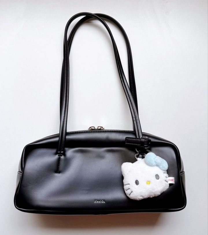 「ツヤ感のある黒が使いやすい。折り畳み傘とペットボトルも入る大きさ、収納力も素敵。キティさんを添えて」