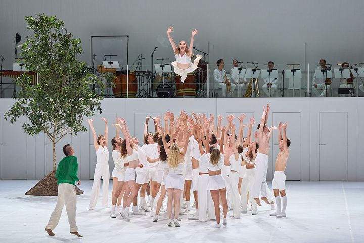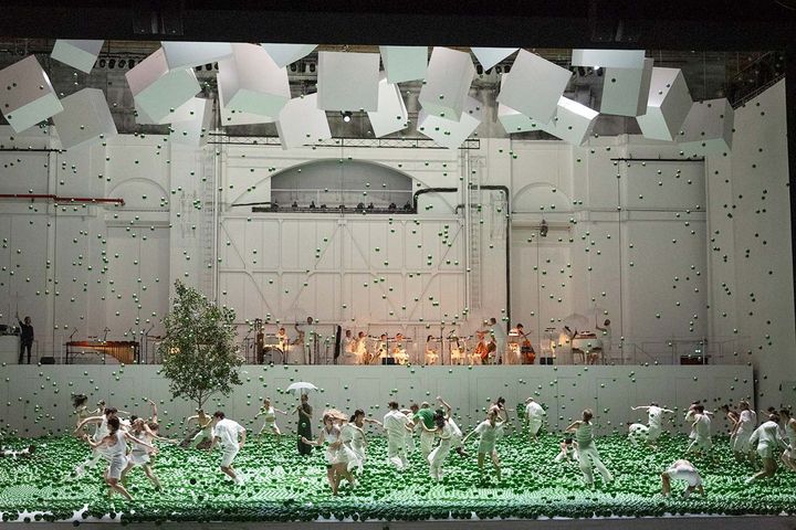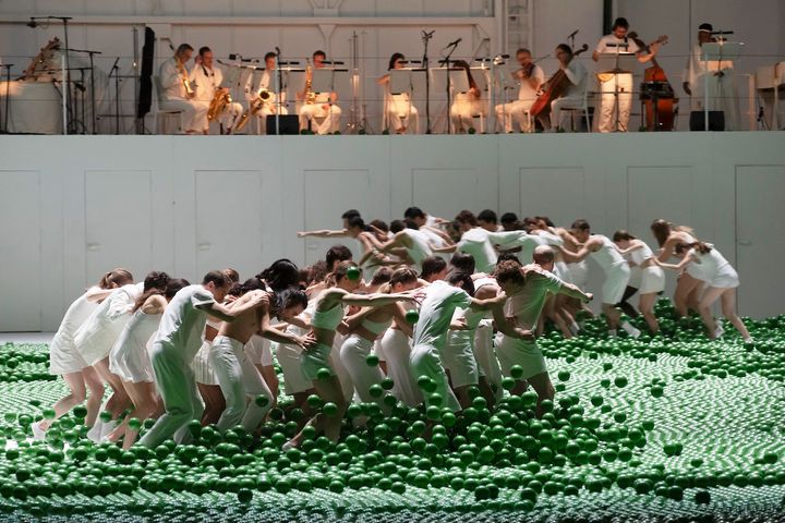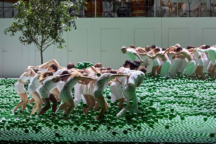 中でも圧巻なのが、舞台上空から降り注ぐ6万個の緑のボール。大雨のように降りしきるボールが舞台を埋め尽くし、ダンサーたちがその中で戯れる。視覚と聴覚を一気に刺激されるような、没入感のある演出だ。