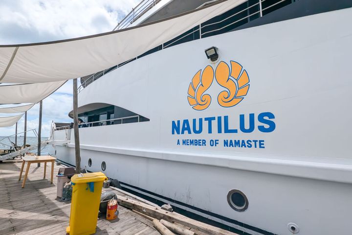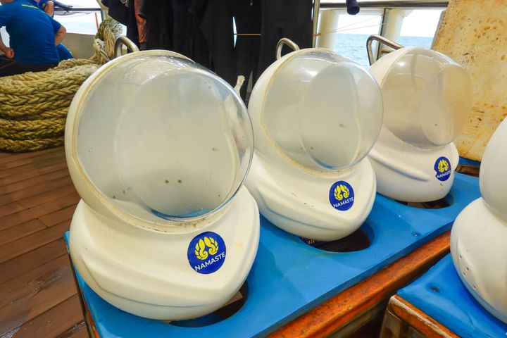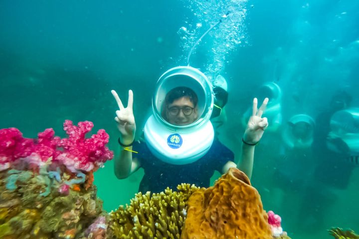 しばらくしてたどり着いたのは、海に浮かぶアクティビティ船「NAUTILUS NAMASTE」。ここでは海中を歩くシーウォーキングを体験。専用のヘルメットをかぶってフーコックの海をのぞき見します。