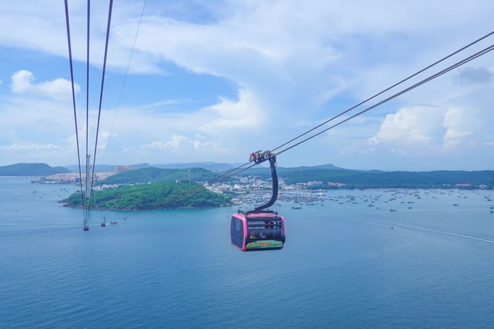 フーコック南部エリアからホントム島までを繋ぐこのロープウェー。乗車後はぐんぐんと高度が上がっていき、あっという間に海と島を一望できる景色に。ゴンドラの平均の高さは約50mで、最高到達点は驚異の170m超! 自然の美しさもさることながら、こんな大規模な乗り物を作ってしまう人間の技術たるや……。
