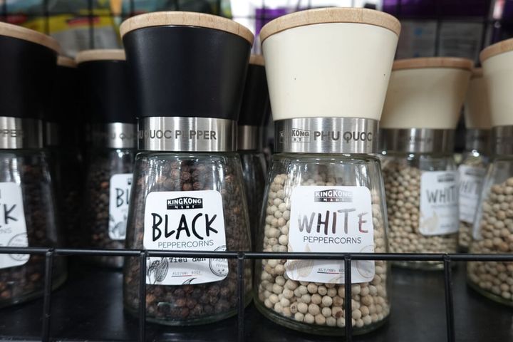 お土産品を販売している店もたくさんあり、フーコック島の名産品のヌクマム(魚醤)、真珠アクセサリー、ローカルなお菓子など、買い迷うものばかり。筆者はお土産にヌクマムと同じ名産品の胡椒を購入。1ビンでたった100,000VND=560円! 安すぎ!