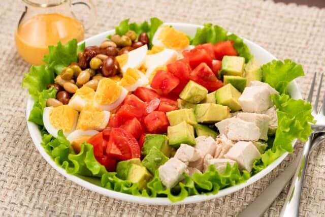 「サラダ=痩せる」は思い込み。ベーコン、チーズ、揚げ物、ナッツ類などが乗ったボリューム系サラダは、1皿500kcalを超えることもあります。さらに、シーザーやごまなどのこってりドレッシングをたっぷりかければ、ラーメン並みの高カロリーメニューに!