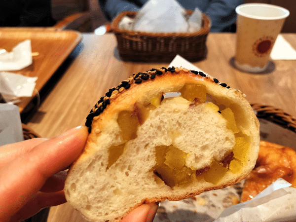 黒ごまと白ごまがたっぷりかかった香ばしいフランスパンに甘いさつまいもがたっぷり♪ごまとさつまいもは相性ピッタリですよね!