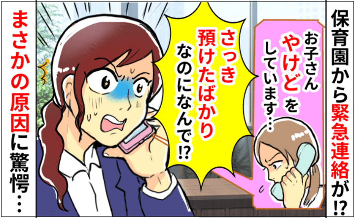 ある日、いつものようにドタバタと家を出て生後6カ月の末っ子を保育園に預けました。するとほどなくして「お子さんがやけどしています」と電話が! 預けたばかりなのに、一体ナゼ!?