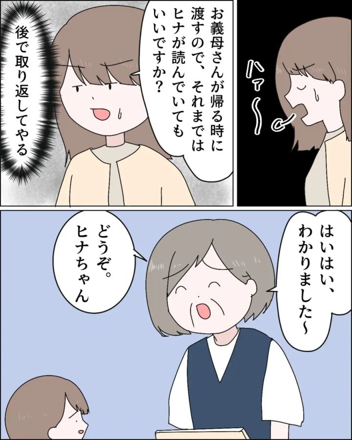 ヒナのお気に入りで、まだ読みたい絵本を「お姉ちゃんでしょ~?」と強引に外孫のために借りる義母にイラッとして思わず大きなため息がこぼれてしまいました。まだ阻止しようとする私は、「お義母さんが帰る時に渡すので、それまではヒナが読んでいてもいいですか?」と言うと、義母は「はいはい、わかりました~。どうぞ。ヒナちゃん。」と絵本をヒナに渡しました。しめしめ。後で取り返してやる!