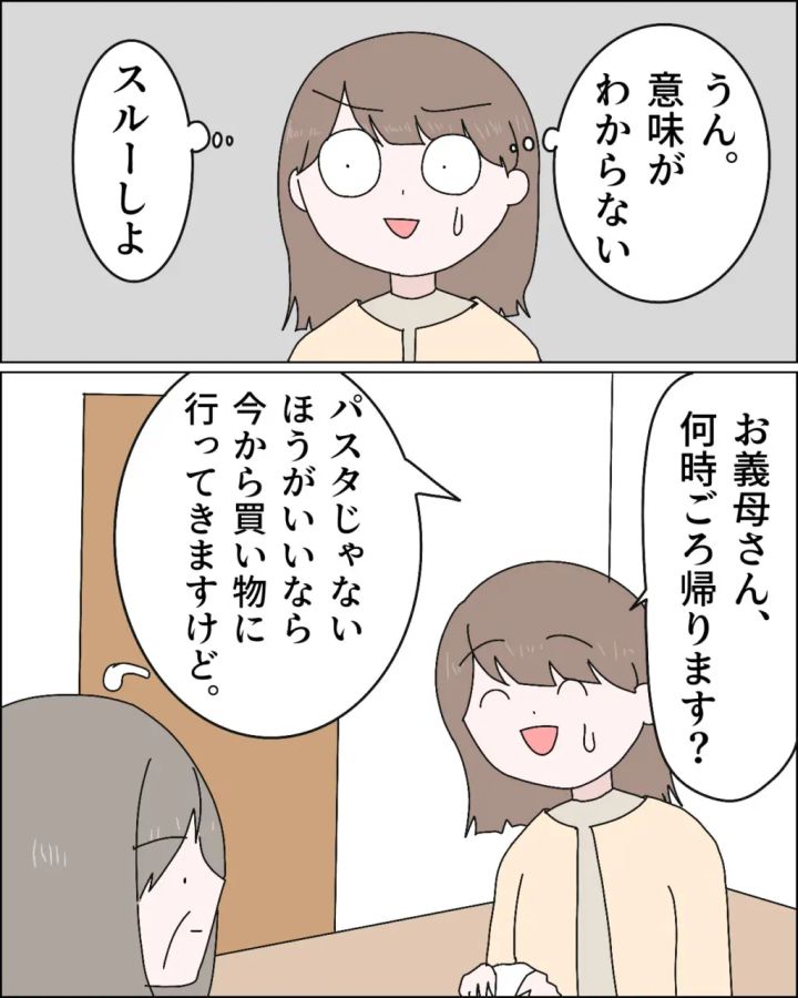 うちに義母の私物を置く場所?しかも1階の和室って指定されて?・・・うん。意味が分からない。私はスルーを決め込むことにして、すぐに話題を変えました。「お義母さん、何時ごろ帰ります?パスタじゃない方がいいなら今から買い物に行ってきますけど。」何時に帰るか聞くのは、嫌味だからね!?