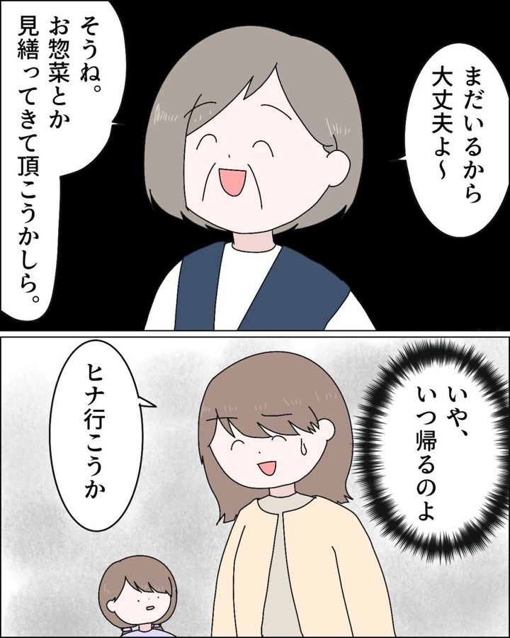 義母は「まだいるから大丈夫よ~」とニッコリ笑うと「そうね。お惣菜とか見繕ってきて頂こうかしら。」と答えましたが、私は(いや、いつ帰るのよ)と重要なところを聞けずにモヤモヤしつつ「ヒナ行こうか」と2人で再び出かけました。