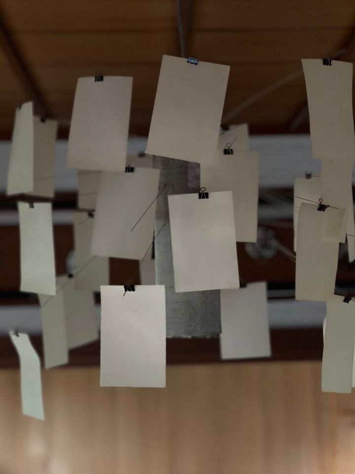 コレクションごとに、デザイナー自身が撮影したフォトプリントをダブルクリップで吊り下げ、店内を彩っていました。