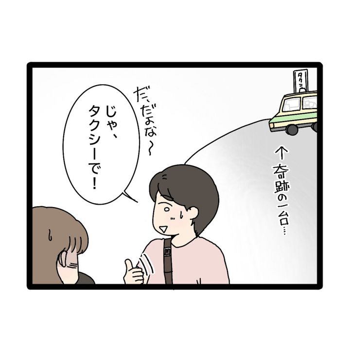 「だ、だよな~、じゃ、タクシーで!」と駅に停まっていた奇跡の1台を見ながら言うひでき。