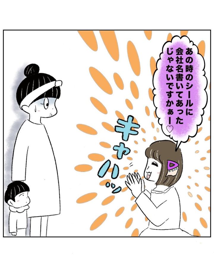 「あの時のシールに、会社名書いてあったじゃないですかぁー!キャハッ」と大はしゃぎするゆかちゃんママを目の前にして呆然とするまるさん。