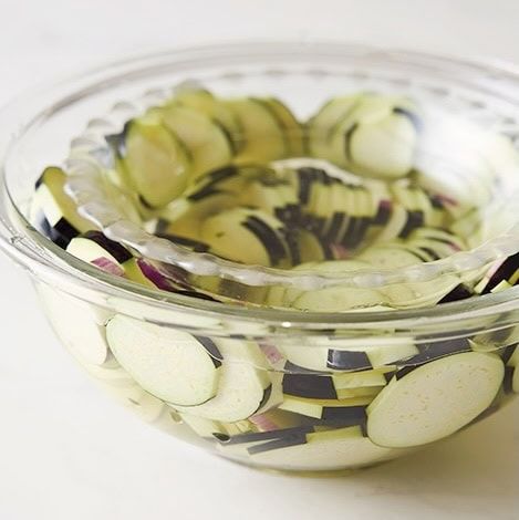POINT_なすは塩水に浸してアクや余分な水分を抜くと、加熱せずに食べられる。浸水中はなすが水面に浮かないよう、皿をのせると◎。