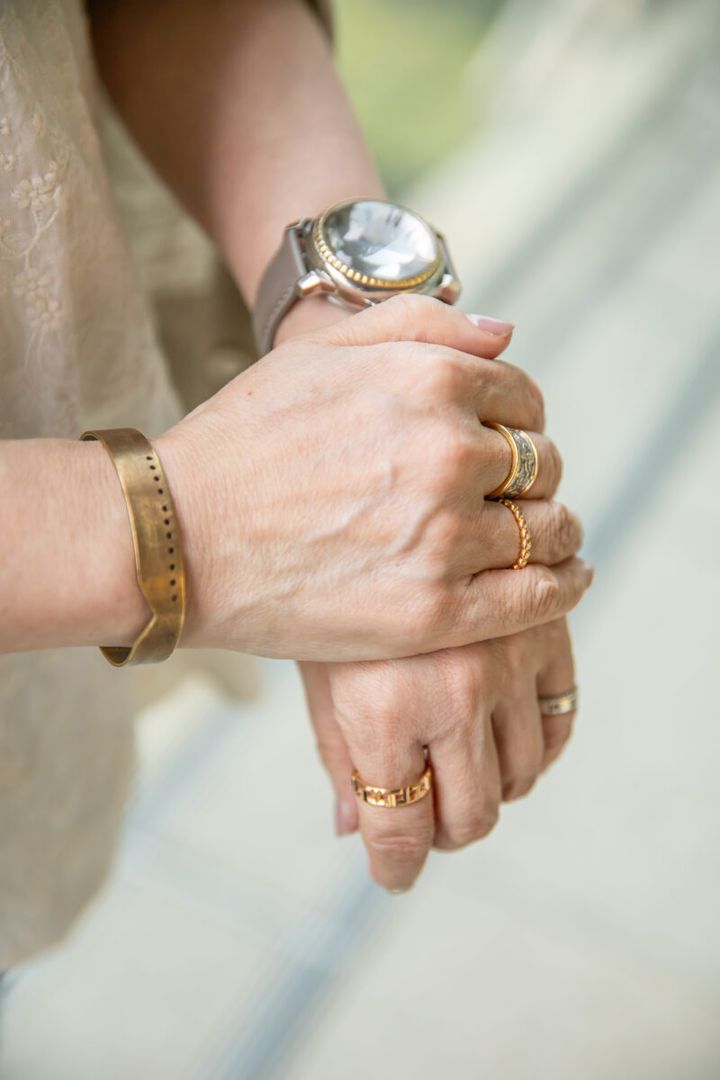 「リトモラティーノ」の腕時計にゴールドのアクセサリーを重ねて手元を華やかな印象に。
