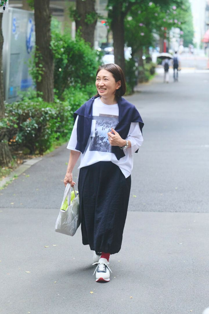 カジュアルになりすぎるTシャツを大人が着るにはコツがあるそう。「シックな色でまとめつつ、小物でバランス調整を。カーディガンを羽織るのが簡単テクですね」