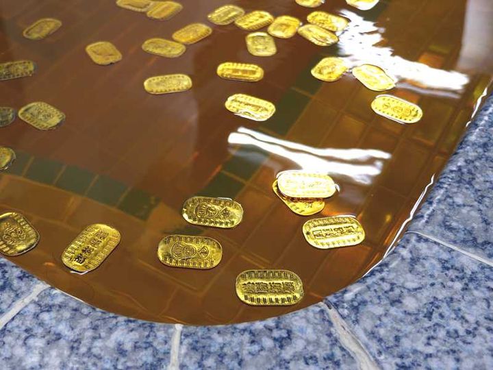 写真は小判型の入浴剤を入れて黄金色になったお湯に、おもちゃの小判が浮かんだ「入浴両の湯」。「薬師湯」の公式サイトでは、1カ月分のお湯のテーマが一覧で確認できますよ。