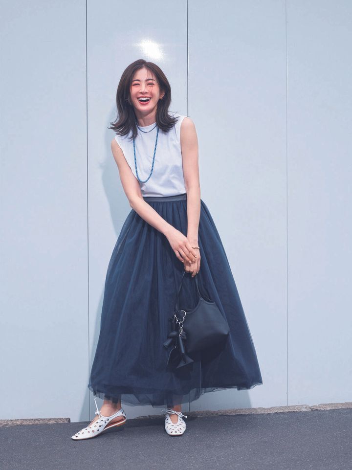 チュールスカートは、シワも目立ちにくく、長時間座っていても安心!女性らしいシルエットをキープして、夏定番のシンプルな白Tコーデに変化を。ドットからの肌見せが特徴的なシューズは、ホワイトで夏らしい軽々しさをアピール。2色に統一したコーデは、上品見えで年代問わずウケ間違えナシ!