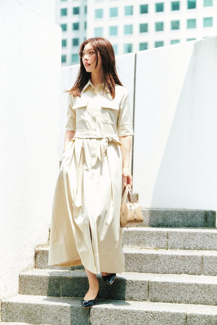 足さばきが良く、高見え抜群な万能シャツワンピ。義実家ウケも間違いナシ。カラーは、夏らしいベージュよりのアイボリー。ウエストベルトは取り外し可能なので、羽織としても着られる多様な着回し力。柔らかいアイボリーをブラックのエナメルパンプスでキリッと引き締め。