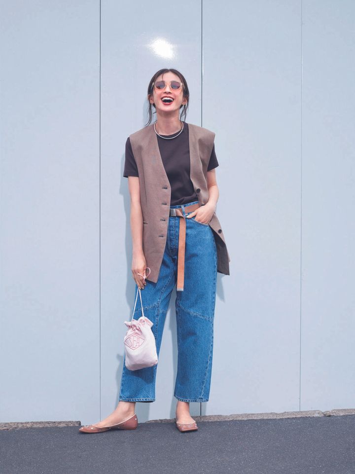 ジレ¥57,200(サクラ/インターリブ)Tシャツ¥5,280(ミラ オーウェン/ミラ オーウェン ルミネ新宿2店)デニムパンツ¥24,200(ローラス/ジャック・オブ・オール・トレーズ プレスルーム)バッグ¥19,800(シー/エスストア)シューズ¥39,600(ピッピシック/ベイジュ)ベルト¥9,900(ハァウ/ウィム ガゼット 玉川髙島屋S・C店)ピアス¥25,300(マリハ)ネックレス¥86,900(ニナ・エ・ジュール/ショールーム ロイト)サングラス¥40,700(ブラン/ライト)