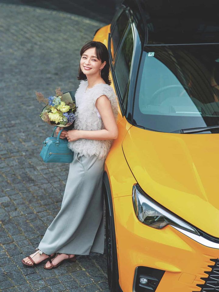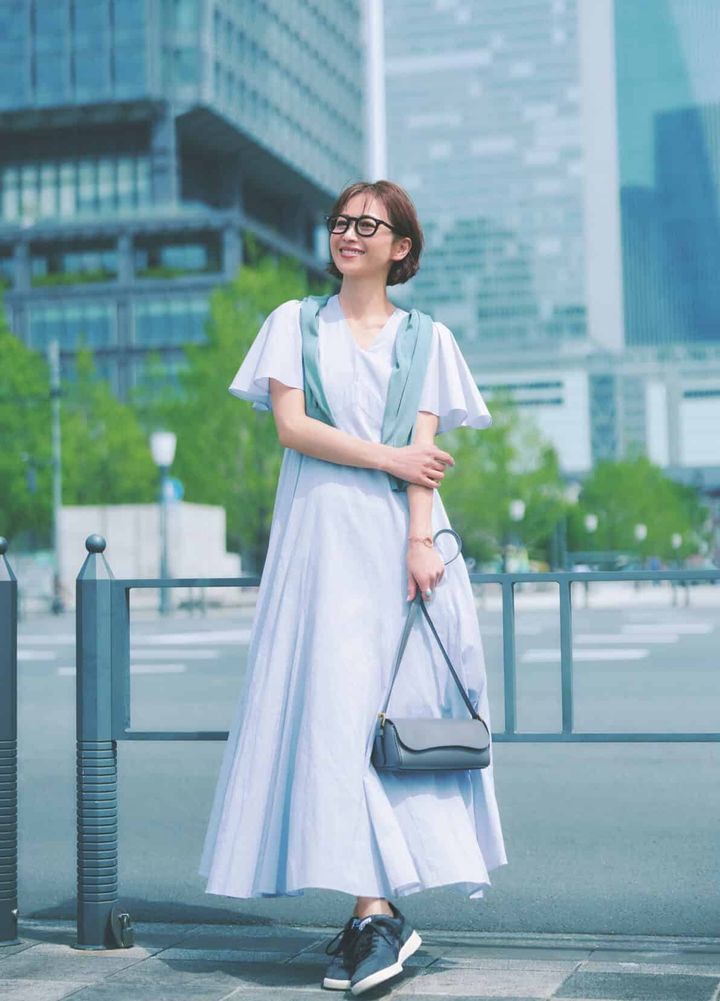ワンピース¥41,800リング¥330,000(ともにマリハ)カーディガン¥15,400(アンクレイヴ)バッグ¥141,900(J&M デヴィッドソン/J&M デヴィッドソン カスタマーセンター)スニーカー¥12,560(アシックス/アシックスジャパン カスタマーサポート部)メガネ¥46,200(アイヴァン/アイヴァン 東京ギャラリー)バングル¥14,300(マークスティールジュエリー/ココシュニック 新宿タカシマヤ店)