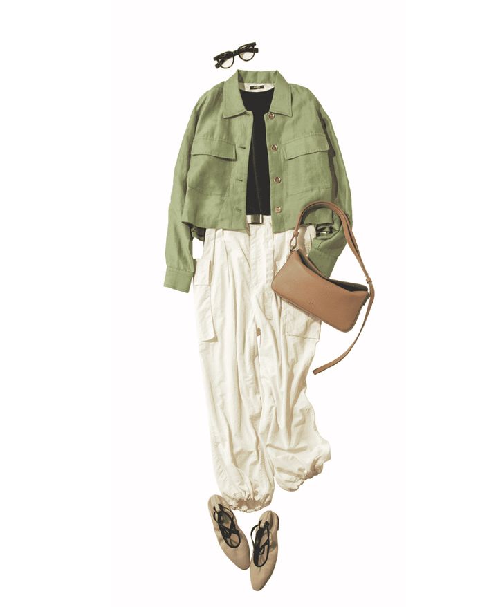 パンツ¥41,800(フィーニィー)ジャケット¥70,400(アロー)カットソー¥9,900(ギャバジン K.T/ファイブフォックス カスタマーサービス)バッグ¥21,450(アンドミューク/アマン)パンプス¥11,550(ル タロン/ル タロン 有楽町マルイ店)メガネ¥66,000(アイヴァン 7285/アイヴァン 7285 トウキョウ)