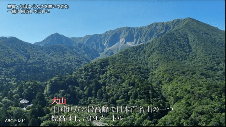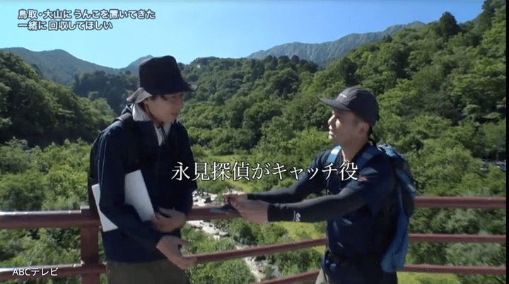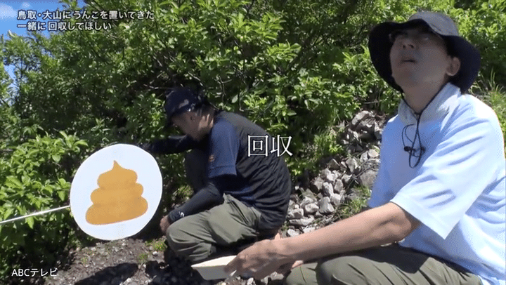 探偵!ナイトスクープ』(ABCテレビ)に鳥取県の男性(47)から依頼が届く。最近趣味で登山を始めた依頼者は、鳥取・大山を初登山中に、五合目付近で腹の具合が悪くなり、七合目で限界に……。頂上までトイレがないため青空の下で排便し、そのまま放置してきてしまったことを、とても後悔しているとのこと。そこで、探偵に一緒に取りに行ってほしいという。