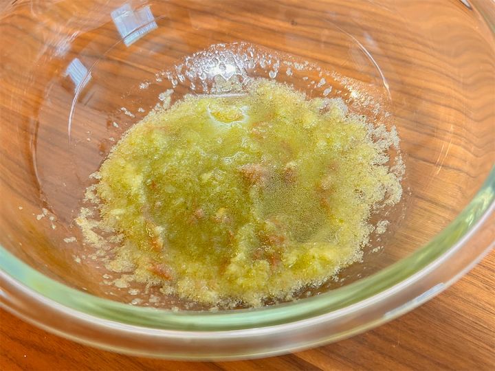 1ですりおろしたきゅうりと、2で刻んだ梅干し、白だし、ゴマ油をボウルに入れて混ぜ合わせます。