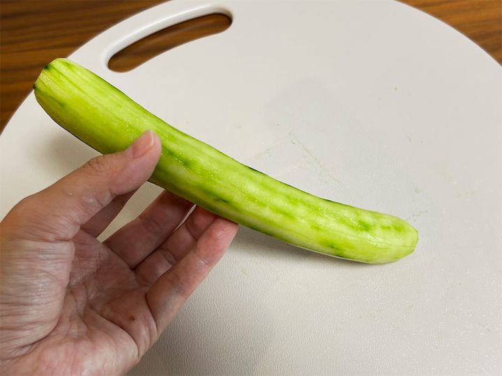 ピーラーを使って、きゅうりの皮を全部剥きます。