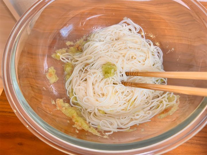 5.水気を切った4のそうめんに、3のきゅうりソースをしっかり絡めます。