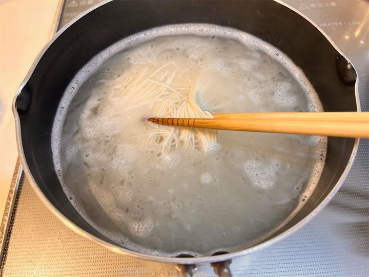 筆者が用意したそうめんは2分ほどで茹で上がりました。