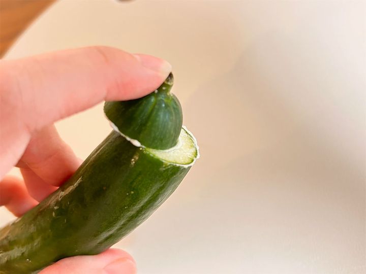 1.きゅうりのヘタを切り落とし、画像のように切り口をこすり合わせます。