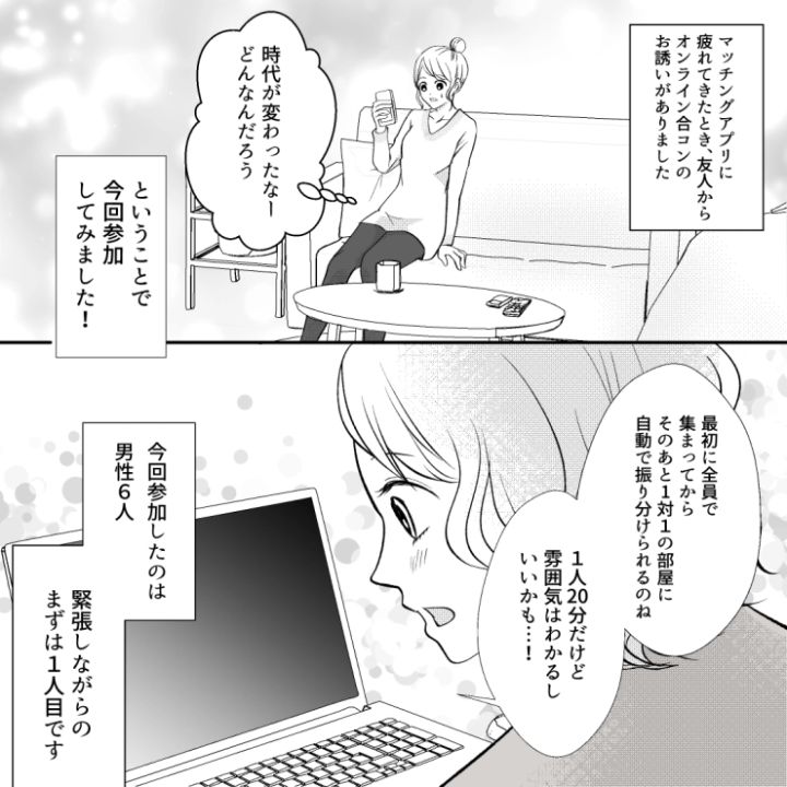 主人公の直美はアラサー女子の31歳。結婚相手を探すべくアプリ婚活に奮闘中!マッチングアプリにも慣れ始めてきたそんなある日、友人に誘われたオンライン合コンに参加することになり・・・!?