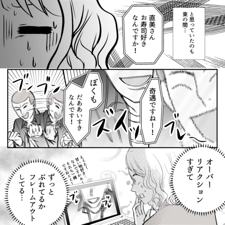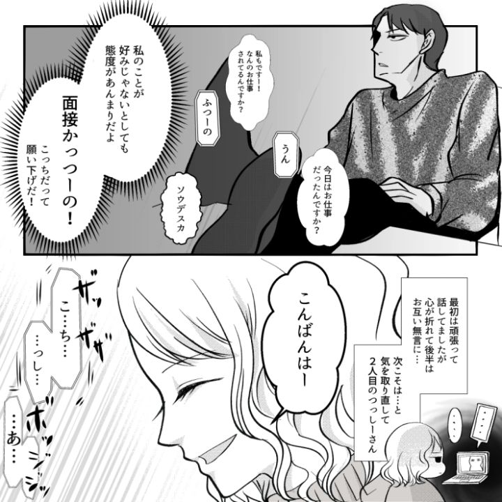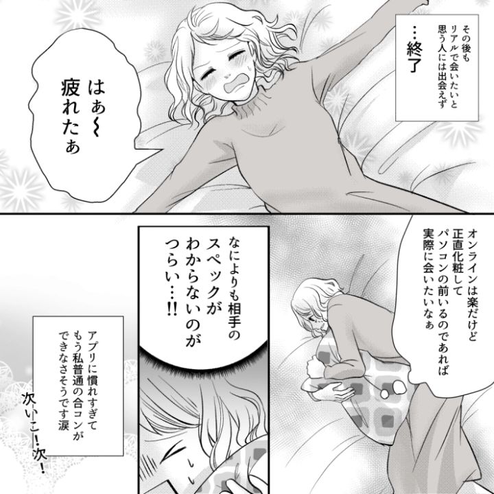 オンライン合コンに参加してみるも、良い人には巡り会えなかった主人公!プリなら相手のスペックが一目で分かるのに・・・とアプリ婚活に慣れてしまった様子。直美の婚活はまだまだ続きそうです。