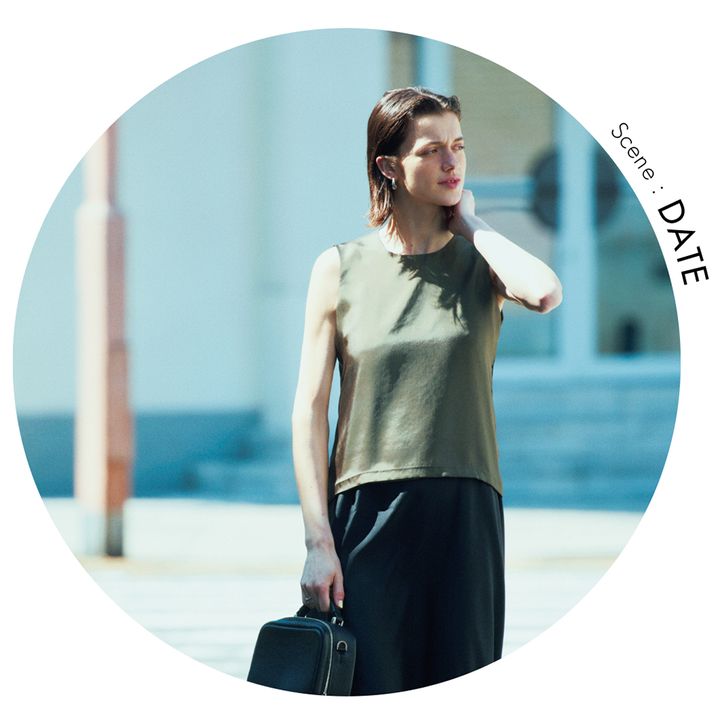 気張らずに、程よい緊張感をもたらすサテン素材のトップス。エレガントな素材は甘い色ではなく、媚びないカーキでハンサムに。 黒ワンピースは着まわし。 カーキトップス/ソブ(フィルム)
