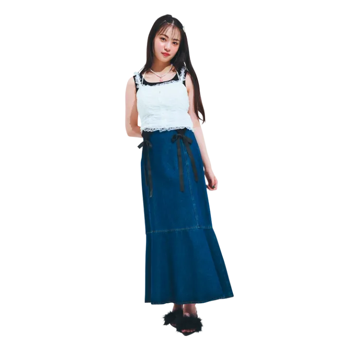 マーメイドデニムスカート 4,990円/Isn’t She? レースキャミソール 2,199円/GRL なかに着たリボンタンクトップ 7,150円/CALNAMUR ネックレス 1,590円、ヘアクリップ 1,390円/ともにNADIA FLORES EN ELCORAZON ミュール 14,300円/rienda(バロックジャパンリミテッド)