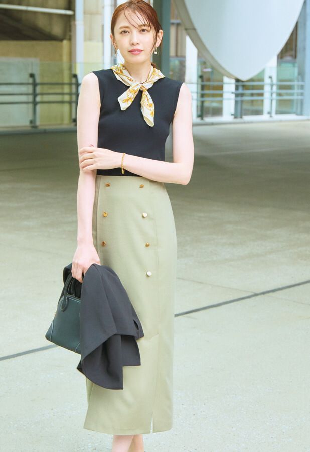 暑さが増してトップスが軽くなると迷い出す通勤服選び。どんなトップスにもマッチするペンシルスカートは、スカーフアレンジで華やかさと上品さを加速させるのが旬♡