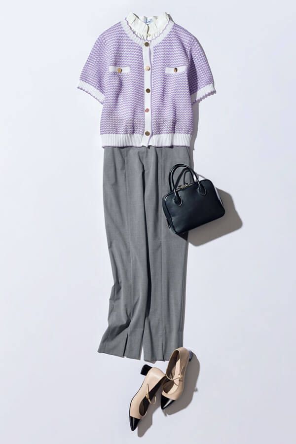 金ボタンとツイード風の編み模様がリッチなカーデは、スイートな配色も魅力。×テーパードパンツのコンサバな合わせを、フェミニンに一変させる決め手に♪ 前を閉じて、スタンドカラーのブラウスをのぞかせる着こなしもおしゃれです。