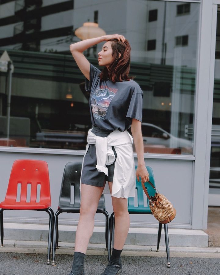 8月14日(木)、ヴィンテージ感のあるグラフィックTシャツを主役に、黒のミニ丈スカショでラフだけどまとまりのあるスタイルに。腰に巻いた白シャツがアクセントになりつつ、シルエットにもメリハリをプラス。全体はやや強めのカジュアルだけど、ころんとした巾着バッグが夏らしい柔らかさを添えてくれます。